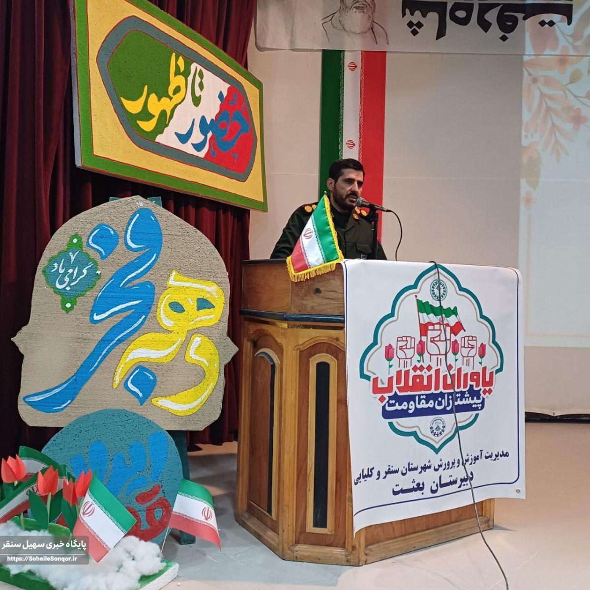 فرمانده سپاه ناحیه سنقر افزود: فهم وتفسیر دانش آموزان و تصمیم انها در آینده شأن تاثیر گذار است دانش آموزان بایستی با تاریخ انقلاب و مبانی نظری انقلاب آشنا شوند دانش آموزان در عرصه دفاع از عزت و هویت ملی بایستی نقش ایفا کنند امروز در جنگ نرم برای مقابله با توطئه های دشمن هوشیار باشند وظیفه آنها امروز در جنگ نرم برای مقابله با دشمن درس خواندن ،تهذیب اخلاق ،هوشیاری سیاسی با تلاش انقلابی است