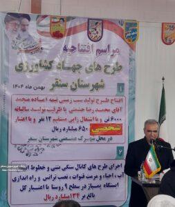 در ادامه این مراسم، مجموعهای از پروژههای جهاد کشاورزی در سطح ۹ روستای شهرستان نیز افتتاح شد. این طرحها شامل اجرای کانالکشی سنگیبتنی، خطوط انتقال آب، احیا و مرمت قنوات، نصب ترانس و راهاندازی ایستگاههای پمپاژ است که با اعتباری بیش از ۱۳۴ میلیارد ریال اجرا شدهاند.