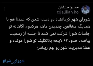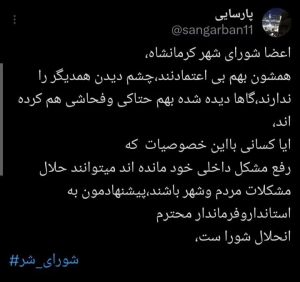 اکنون هم که هیئت حل اختلاف به انحلال شورای اسلامی شهر کرمانشاه رأی داده هرچند که این موضوع قابل تجدیدنظر است اما مطالبه عمومی که بخشی از آن در قالب پویش شورای شهر یا شورای شر به نمایش گذاشته شده، بر ضرورت پیگیری جدی موضوع توسط متولیان امر استوار شده چرا که جلوی ضرر را از هرجا بگیریم منفعت است.
