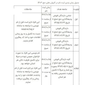 سازمان حج و زیارت مطابق با ظرفیت تخصیصیافتۀ حج تمتع به ایران، افرادی را که تا ۲۹ اسفند ۱۳۸۵، تا ۳۱ اردیبهشت ۱۳۸۶ و تا ۳۱ تیرماه ۱۳۸۶ برای حج تمتع ودیعهگذاری کردهاند، برای پیش ثبتنام در کاروانهای حج ۱۴۰۳ فراخواند.