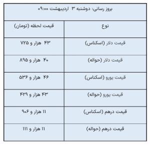 از سوی دیگر، اسکناس درهم امارات نیز با افزایش نسبت به روز کاری گذشته، ۱۱ هزار و ۹۰۶ تومان ارزشگذاری شده است و نرخ حواله درهم نیز ۱۱ هزار و ۱۱۱ تومان است.